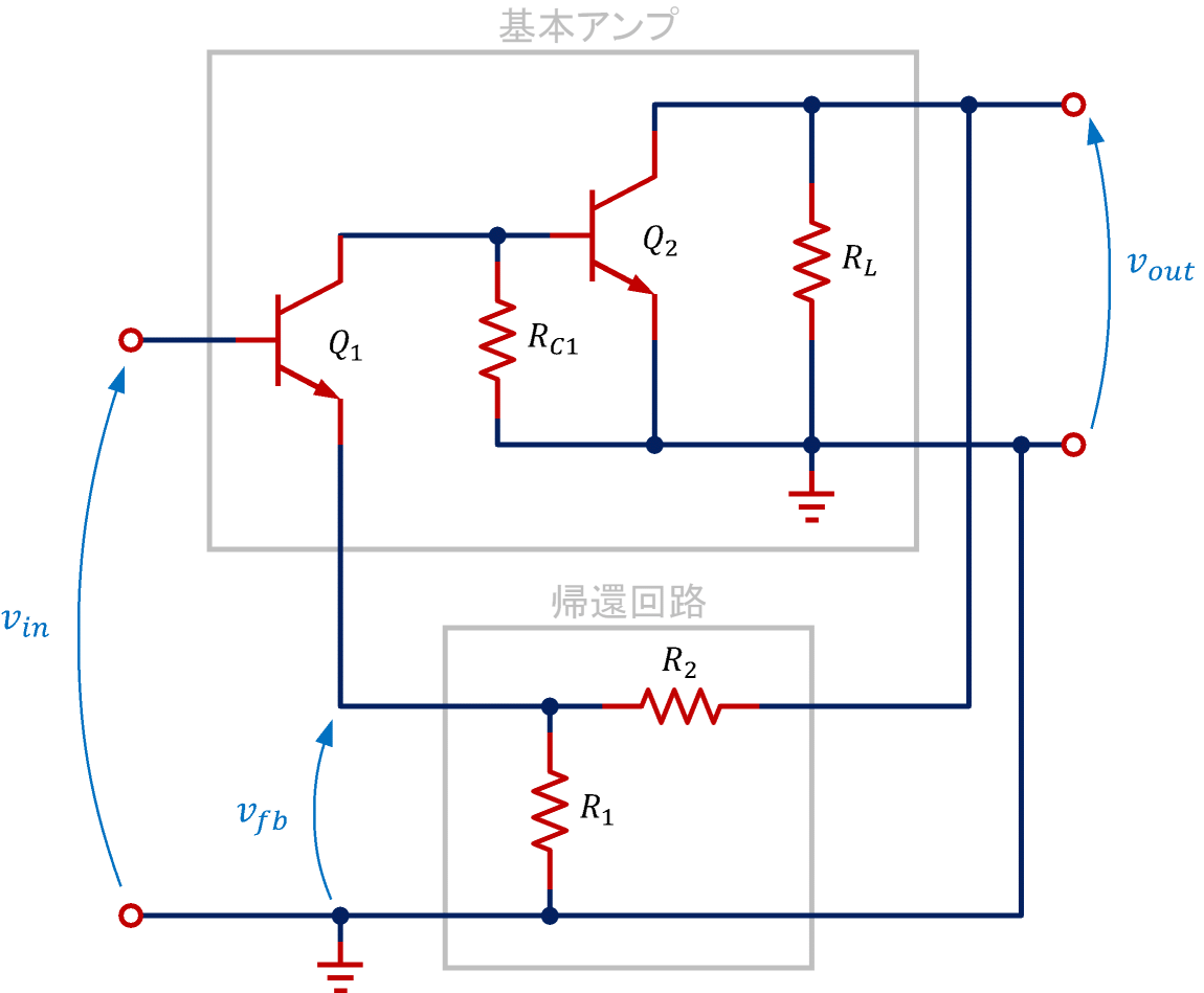 負帰還を利用したアンプのブロック図は図1のようになります。基本アンプはエミッタ接地アンプ、帰還回路は抵抗分圧回路とします。出力voutを帰還回路で減衰させた信号vfbを帰還信号とし、入力vinと帰還信号vfbの差を基本アンプで増幅して出力voutとします。