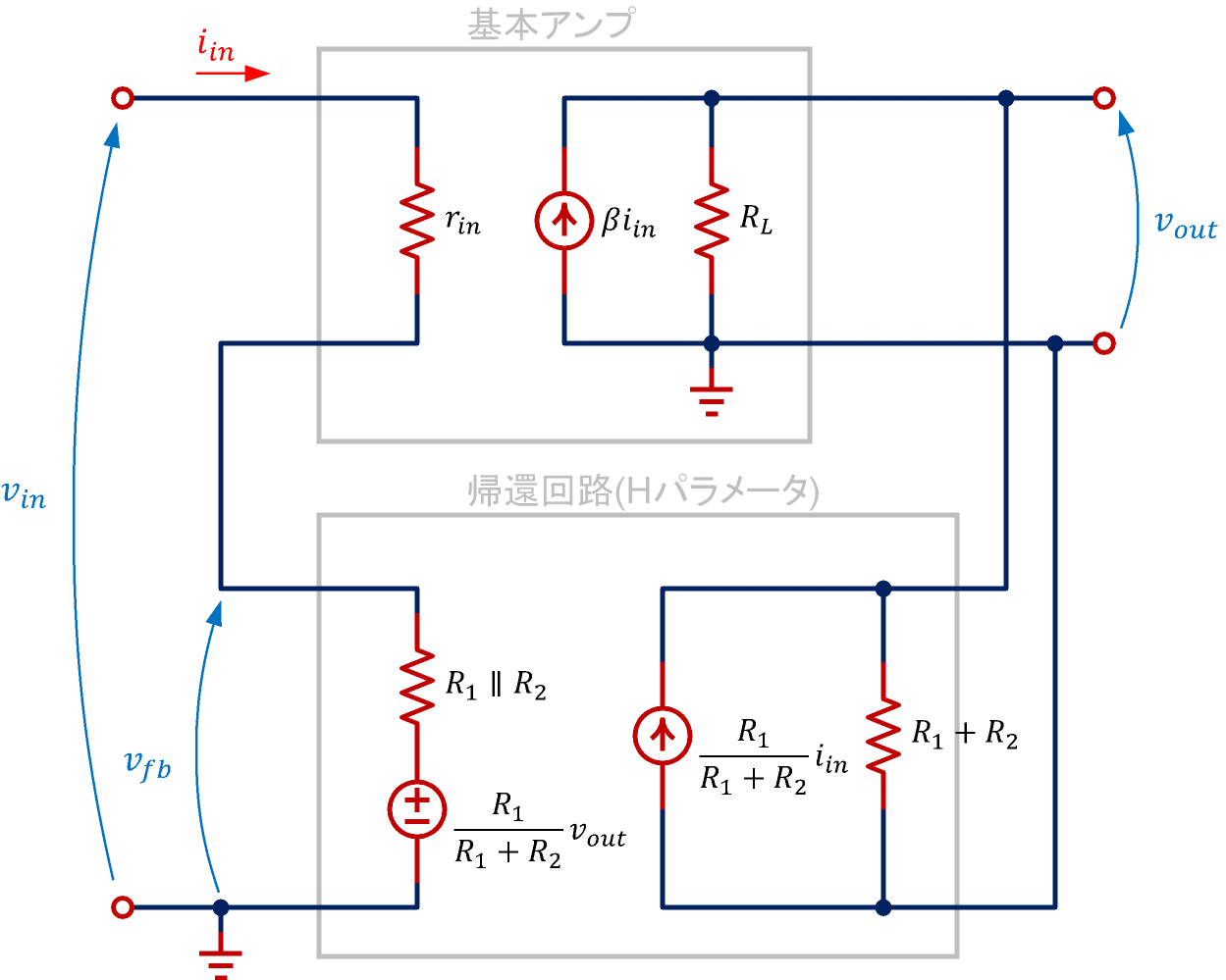 電圧帰還・直列注入形は、図3のようにHパラメータ等価回路を使用すると解析しやすくなります。 基本アンプの入力側から帰還回路を見ると、voutがR1とR2で分圧されて帰還されることが分かります。一方、基本アンプの出力側から帰還回路を見ると、入力信号が帰還回路を経由して直接出力に伝わる成分$\frac{R_1}{R_1+R_2}i_{in}$が生じることが分かります。この成分は基本アンプの$\beta i_{in}$に対して小さいので無視できます。また、帰還回路の入力抵抗R1+R2が基本アンプの負荷として接続されることも分かります。