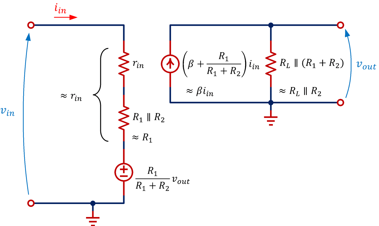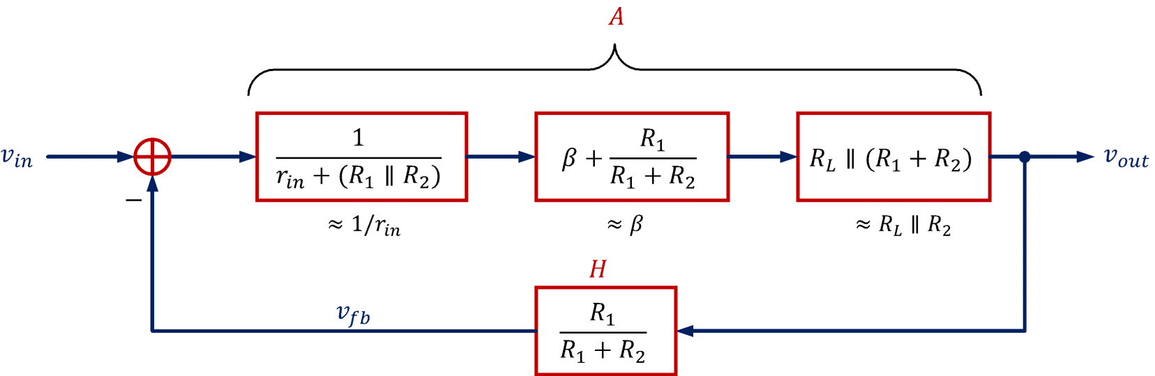 \begin{align} A &= \frac{1}{r_{in}+(R_1\parallel R_2)}\left(\beta+\frac{R_1}{R_1+R_2}\right)\left[R_L\parallel(R_1+R_2)\right]\\ &\approx \beta\frac{R_L\parallel R_2}{r_{in}}\\ H &=\frac{R_1}{R_1+R_2}\\ \text{ループゲイン:}\quad T&=AH\\ \text{ゲイン:}\quad \frac{v_{out}}{v_{in}}&=\frac{A}{1+T}\\ &\approx \frac{1}{H}=1+\frac{R_2}{R_1}\quad T\gt\gt 1\text{ の場合} \end{align}となります。