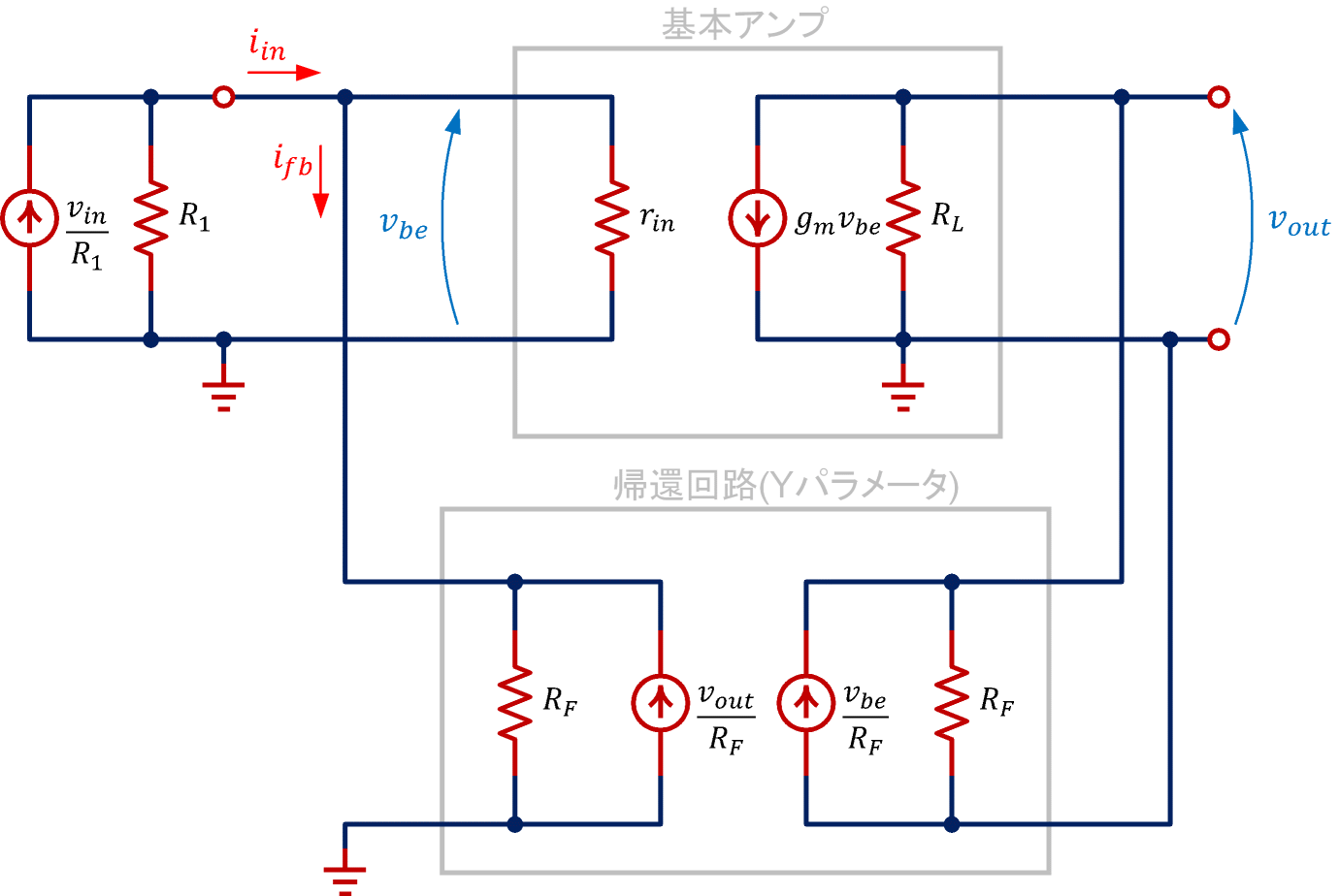 電圧帰還・並列注入形は、図3のようにYパラメータ等価回路を使用すると解析しやすくなります。 基本アンプの入力側から帰還回路を見ると、voutに比例した電流が帰還されることが分かります。一方、基本アンプの出力側から帰還回路を見ると、入力信号が帰還回路を経由して直接出力に伝わる成分vbe/RFが生じることが分かります。この成分は基本アンプのgmvbeに対して小さいので無視できます。また、帰還回路の入力抵抗RFが基本アンプの負荷として接続されることも分かります。 vinとR1の部分はテブナンの定理を適用して電流源に変換しています。