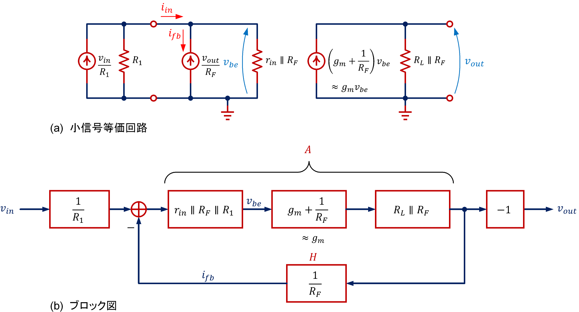 図3の基本アンプと帰還回路を融合させると図4(a)となります。図4(b)はそのブロック図です。