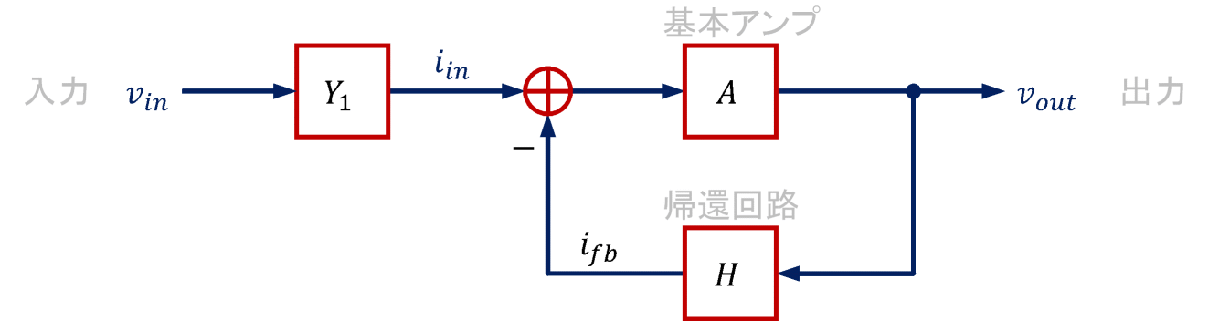 \begin{align} \text{ゲイン:}\quad \frac{v_{out}}{v_{in}}&=\frac{A}{1+AH}Y_1\\ &\approx \frac{1}{H}Y_1\quad AH\gg 1\text{ の場合} \end{align}となります。Y1は入力電圧vinを電流に変換する役割をもちます。