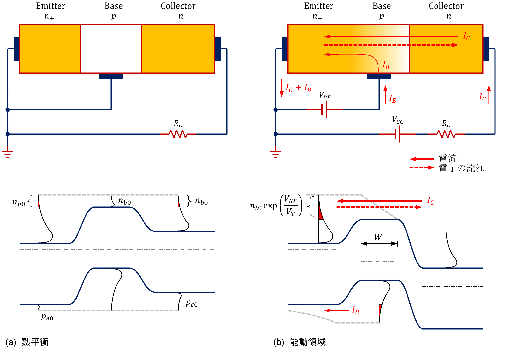 を導出します。 図1(a)は熱平衡時のnpnトランジスタのバンド図とキャリアの分布です。エミッタ及びコレクタ領域(n形半導体)では電子密度が大きく、ベース領域(p形半導体)ではホール密度が大きいですが、エミッタ-ベース間障壁、コレクタ-ベース間障壁を越えるエネルギーをもつキャリアに着目すると、密度は一様であるのでキャリアの流れは生じません。