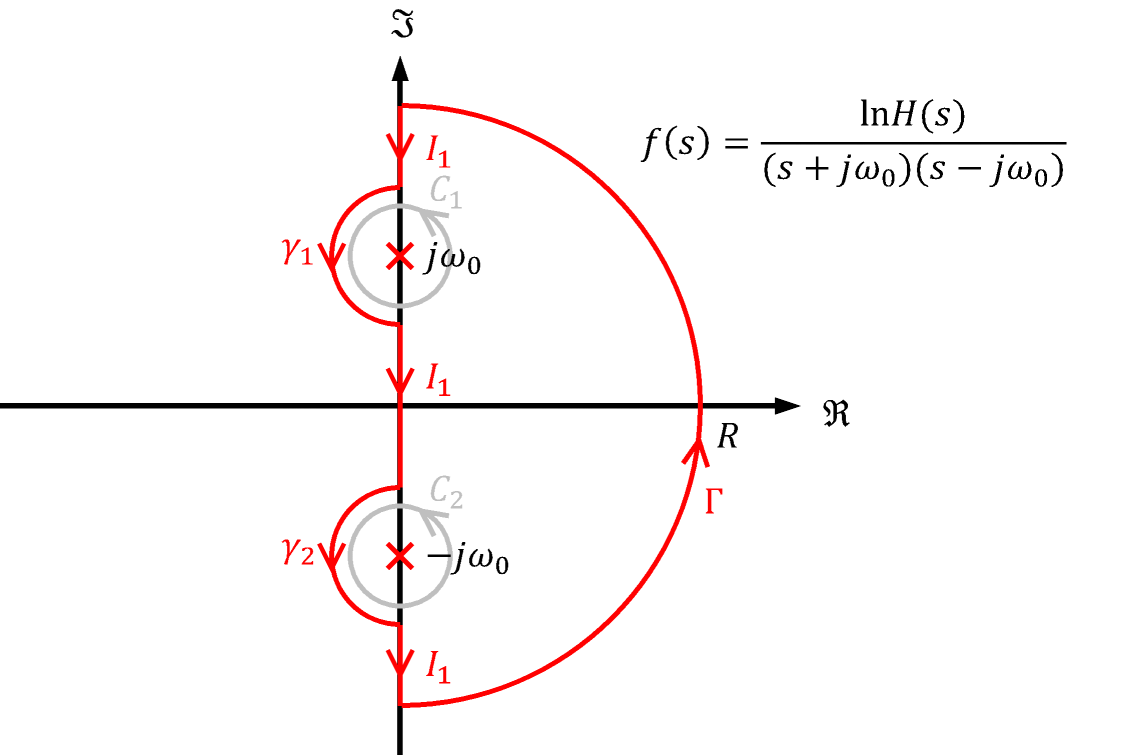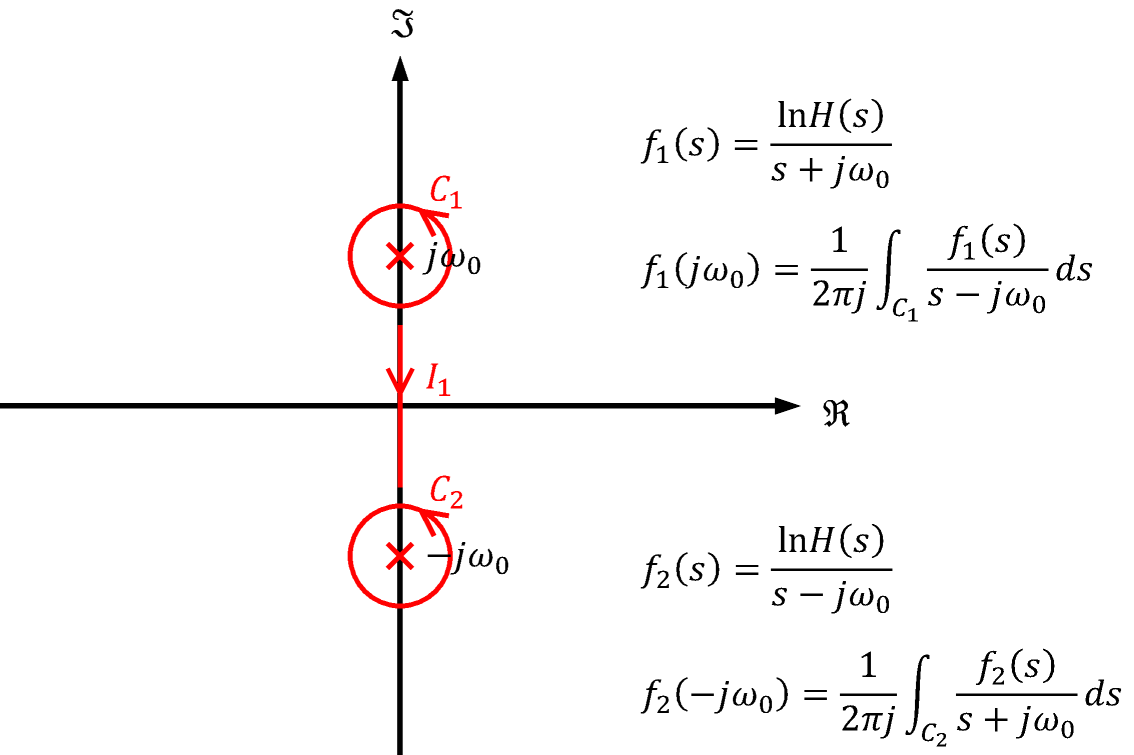 \begin{align} \arg H(j\omega_0)&=\frac{\omega_0}{2\pi j}\left(\int_{C_1}f(s)ds+\int_{C_2}f(s)ds\right)\\ f(s)&=\frac{\ln H(s)}{(s+j\omega_0)(s-j\omega_0)} \end{align}と、位相arg H(jω0)が周回積分C1とC2の和として表されます。さらに、留数定理を利用して図3のように積分路を変更すると