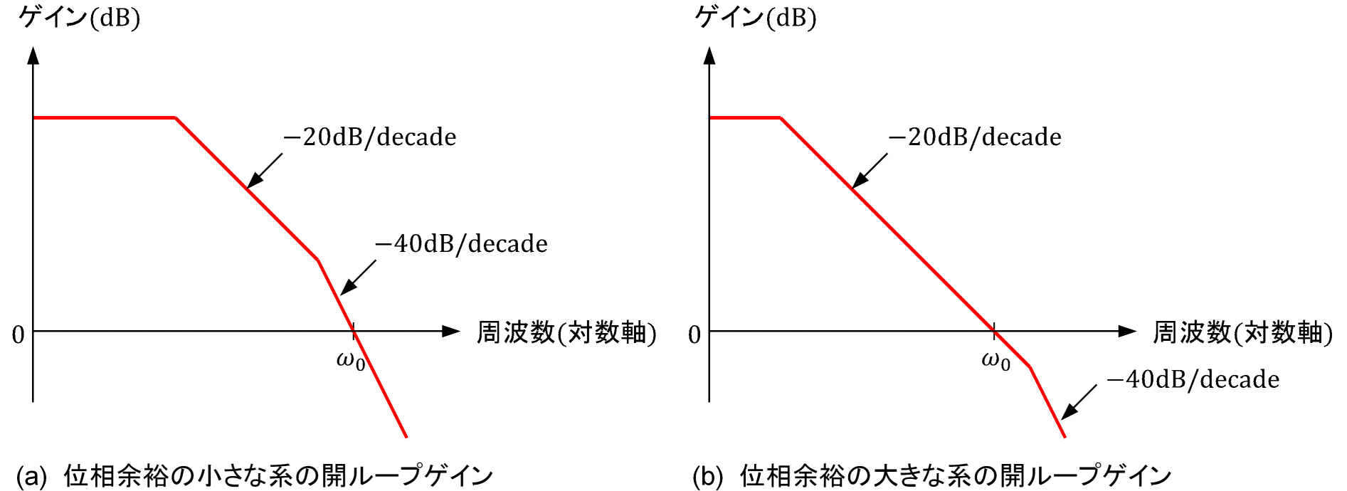 ボードの定理を覚えれば、オペアンプ回路などの位相補償を考える際、ゲインの傾きだけから位相余裕の大・小を判断できるので、非常に有用です。たとえば、開ループゲインが図1(a)と図1(b)の系を比較すると、(a)のほうが(b)よりも0dBとなる周波数ω0における傾きが大きいので位相余裕が小さい(発振しそう)だと分かります。
