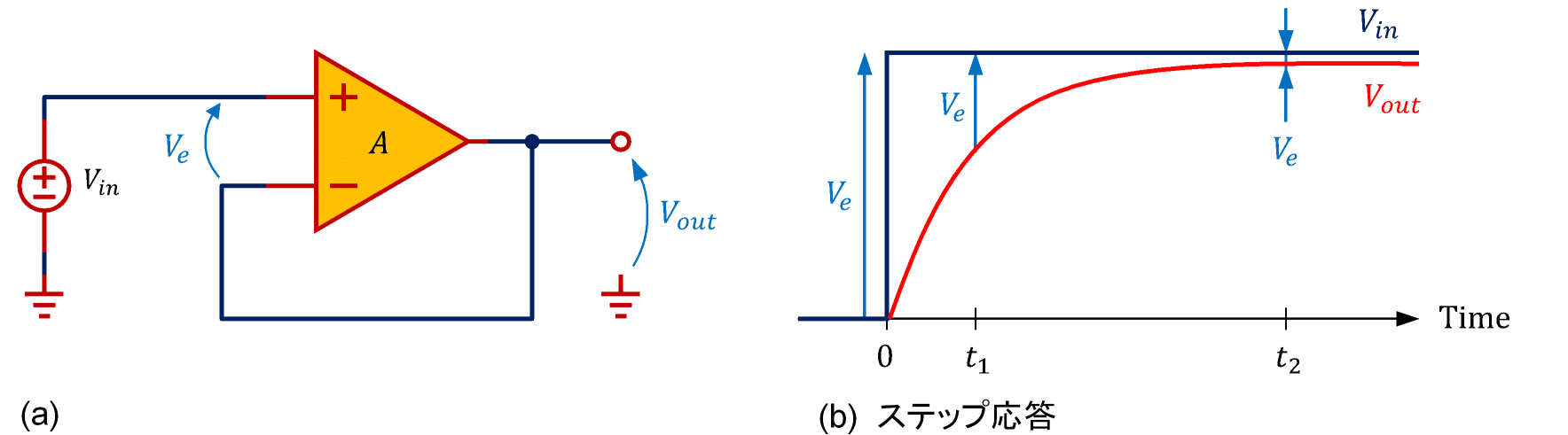 - 時刻t=0: 誤差信号はVe=Vin-Vout=Vinとなります。このVeがA倍されて出力はAVeになろうと上昇します。ただし、オペアンプの内部回路の時定数によって変化の速度が制限されるので、(瞬時にVout=AVeとはならず) Vout<AVe の状態となります。