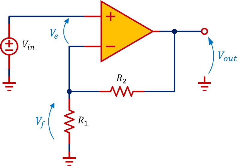 \begin{align} V_{out}=\frac{R_1+R_2}{R_1}V_f \approx\frac{R_1+R_2}{R_1}V_{in}=\left(1+\frac{R_2}{R_1}\right)V_{in} \end{align}となります。回路のゲインは、帰還回路の分圧比の逆数になります。オペアンプのゲインとは無関係に、外付け抵抗比R2/R1によってゲインを設定することができます。