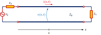 信号線の一端に電圧を印加すると、その電圧は光速に近いスピードで伝搬します。一般に、数100MHz以下の周波数で信号線が短い場合は、入力された信号が瞬時に出力端に到達すると考えて問題ありません。しかし、数GHz以上の高周波信号や装置間を結ぶ同軸ケーブルのように長い距離を伝わる信号については、伝達の遅れが無視できなくなります。このような場合は、信号線を分布定数回路(伝送線路)とみなし、電圧・電流を時間及び位置の関数として取扱います(図1)。