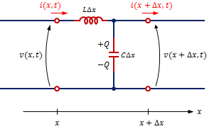 分布定数回路のふるまいは、図2のように幅Δxの微小区間の中にインダクタとキャパシタが分布している等価回路で解析します。インダクタに電圧が印加されると電流は遅れて増加し、キャパシタに電流が流れると電圧は遅れて増加するので、このモデルによって信号の伝搬遅延が定式化できます。