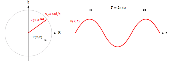 \begin{align} &v(x,t)=\Re[V(x)e^{j\omega t}]\\ &i(x,t)=\Re[I(x)e^{j\omega t}] \end{align}のように複素数を使用して表記します。 $V(x)e^{j\omega t}$は、図3のように複素平面上を正の向き(反時計回り)に角周波数ωで回転するベクトルで、これを実軸へ投影した成分が実際の電圧v(x,t)となります。$I(x)e^{j\omega t}$についても同様です。$V(x)e^{j\omega t}$ と $I(x)e^{j\omega t}$は同じ角周波数で回転しますが、これを時刻t=0で止めたものがV(x), I(x)でそれぞれv(x,t), i(x,t)のフェーザといいます。