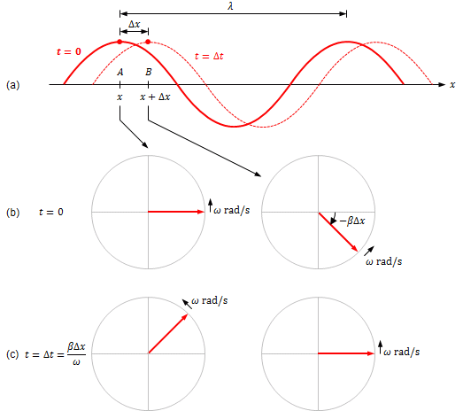 ここで、図4(b)のように時刻t=0で位置xの回転ベクトルの位相を0とすると、位置x+Δxにおける回転ベクトルの位相は−βΔxとなります。回転ベクトルは角周波数ωで回転しているので、位置x+Δxにおける回転ベクトルは時刻Δt=βΔx/ωに位相が0になります(図4(c))。これは、位相0の点が速度Δx/Δt=ω/βで移動したことを意味します。この速度を位相速度といいます。 よって、$C_1e^{-j\beta x}$は、x軸の正の方向へ伝搬する波を表します。