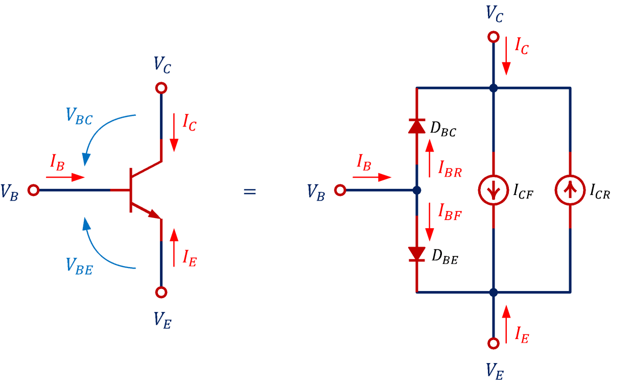 \begin{align} &I_C=I_{CF}-I_{CR} -I_{BR}\\ &I_{CF} =\frac{I_S}{q_b}\left[\exp\left(\frac{V_{BE}}{V_T}\right)-1\right]\\ &I_{CR} =\frac{I_S}{q_b}\left[\exp\left(\frac{V_{BC}}{V_T}\right)-1\right]\\ &I_S=\text{IS}\times\text{AREA}\\ &q_b=\left(1-\frac{V_{BC}}{\text{VAF}}-\frac{V_{BE}}{\text{VAR}}\right)^{-1}\\ \end{align}ベース電流