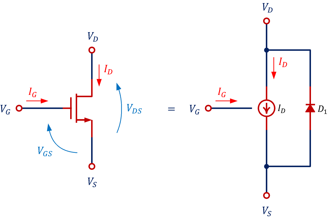 - CGS,CGD,CJOの電圧依存性・温度依存性は考慮されていません(線形容量を並列接続したのと等価です)。