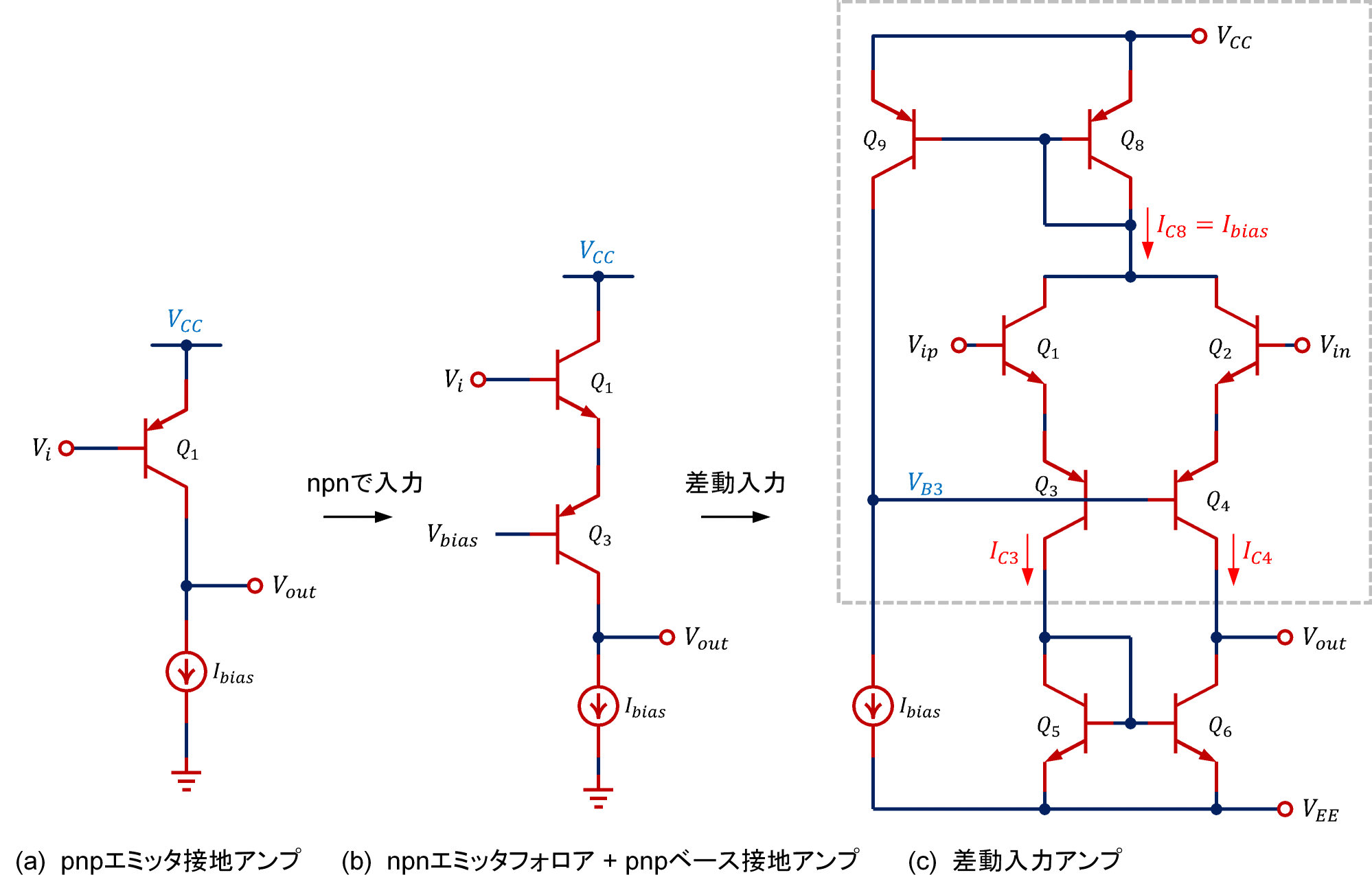図1(a)はpnpトランジスタによるエミッタ接地アンプ、(b)はnpnトランジスタを使用して(a)と同じ動作を実現したもので、Q1はエミッタフォロア、Q3はベース接地アンプとして動作します。 (b)を差動入力とすると(c)になります。