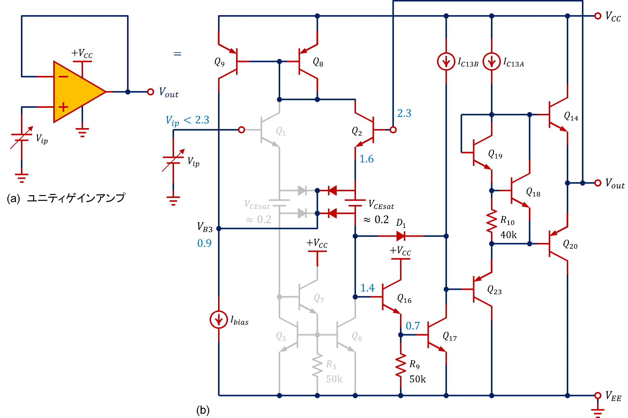 図2(a)のようにユニティゲインアンプとして入力Vipを徐々に下げた場合、Vipが何Vまで正常動作するか考えます。 イマジナリーショートによりQ2のベース電圧はVip、Q4のエミッタ電圧はVip−0.7V、コレクタ電圧はVBE17+VBE16=0.7+0.7=1.4Vなので、エミッタ-コレクタ間電圧VEC4は