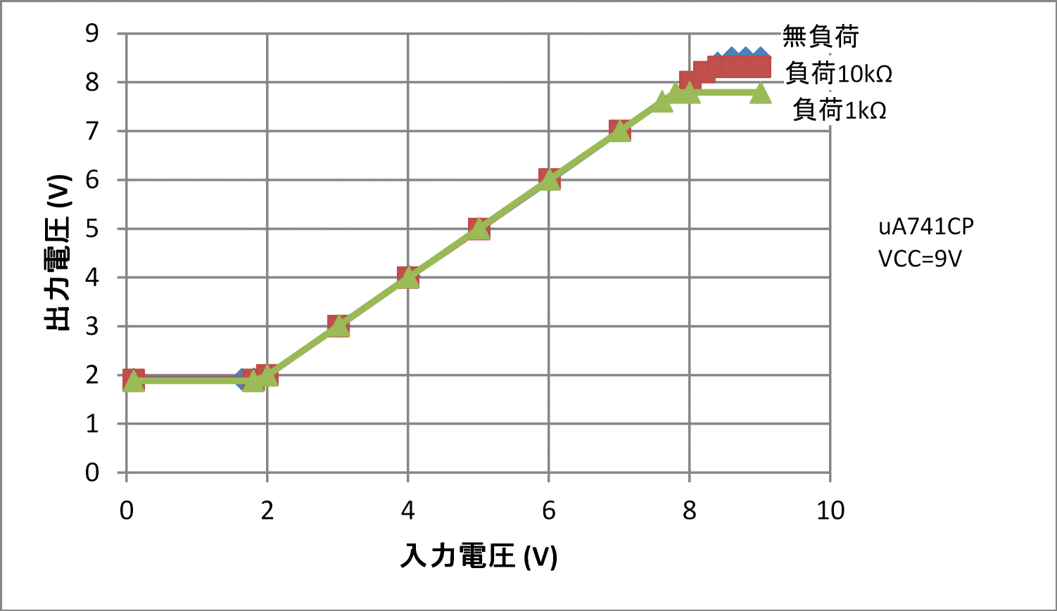 電源電圧VCC=9Vで測定した結果です。入力が0V付近でも出力がHighに跳躍しません。