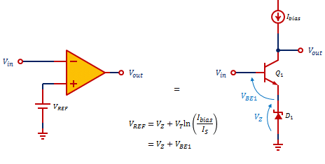 \begin{align} V_{REF}=V_z+V_{BE1} \end{align}となります。VREFを電源電圧に依存しない定電圧源とするため、定電流源Ibiasを使用してQ1のコレクタ電流を設定します。